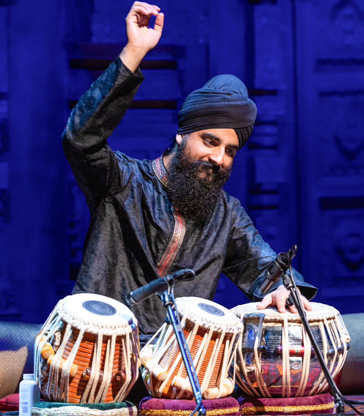 He has performed with maestros including Ustad Amjad Ali Khan, Ustad Shahid Parvez, Pandit Birju Maharaj, Niladri Kumar and Anoushka Shankar, appearing at major venues including Royal Albert Hall, Southbank Centre, Abbey Road Studios and Glasshouse International Centre for Music (Sage). His collaborations span diverse projects with Soumik Datta, Kefaya, Michael Messer’s Mitra and Pagrav Dance Company, bringing tabla into contemporary, cross-cultural and dance contexts. Gurdain also maintains a long association with the Darbar Festival, honouring his family’s legacy.